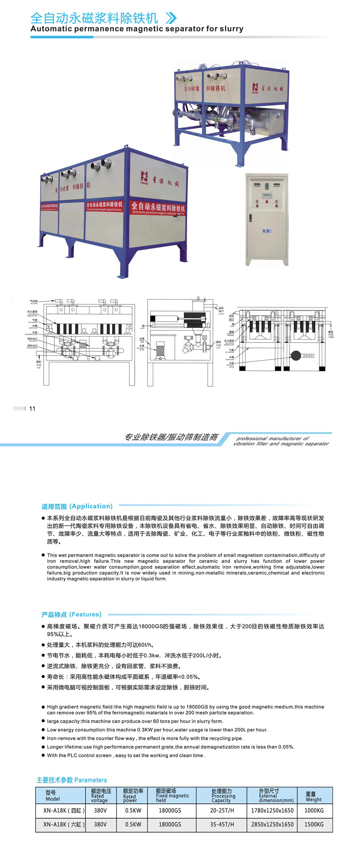 Application This wet permanent magnetic separator is come out to solve the problem of small magnetism contamination,difficulty of iron removal,high failure.This new magnetic separator has function of lower power consumption,lower water consumption,good separation effect,automatic iron remove,working time adjustable,lower failure,big production capacity.It is now widely used in mining,non-metallic minerals,ceramic,chemical and electronic industry magnetic separation in slurry or liquid form