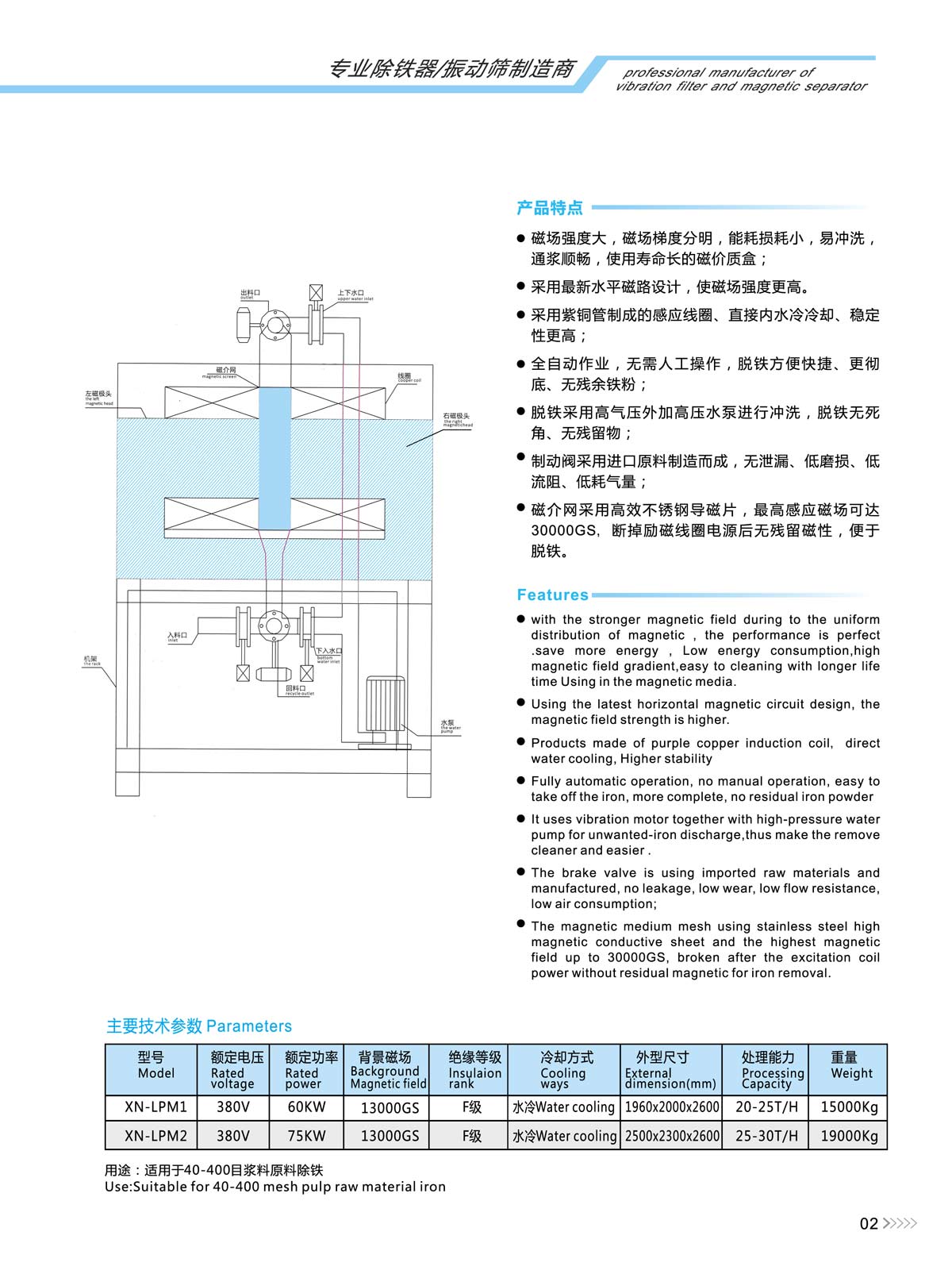 ·The magnetic medium mesh using stainless steel high magnetic conductive sheet and the highest magnetic field up to 30000GS, broken after the excitation coil power without residual magnetic for iron removal. ;